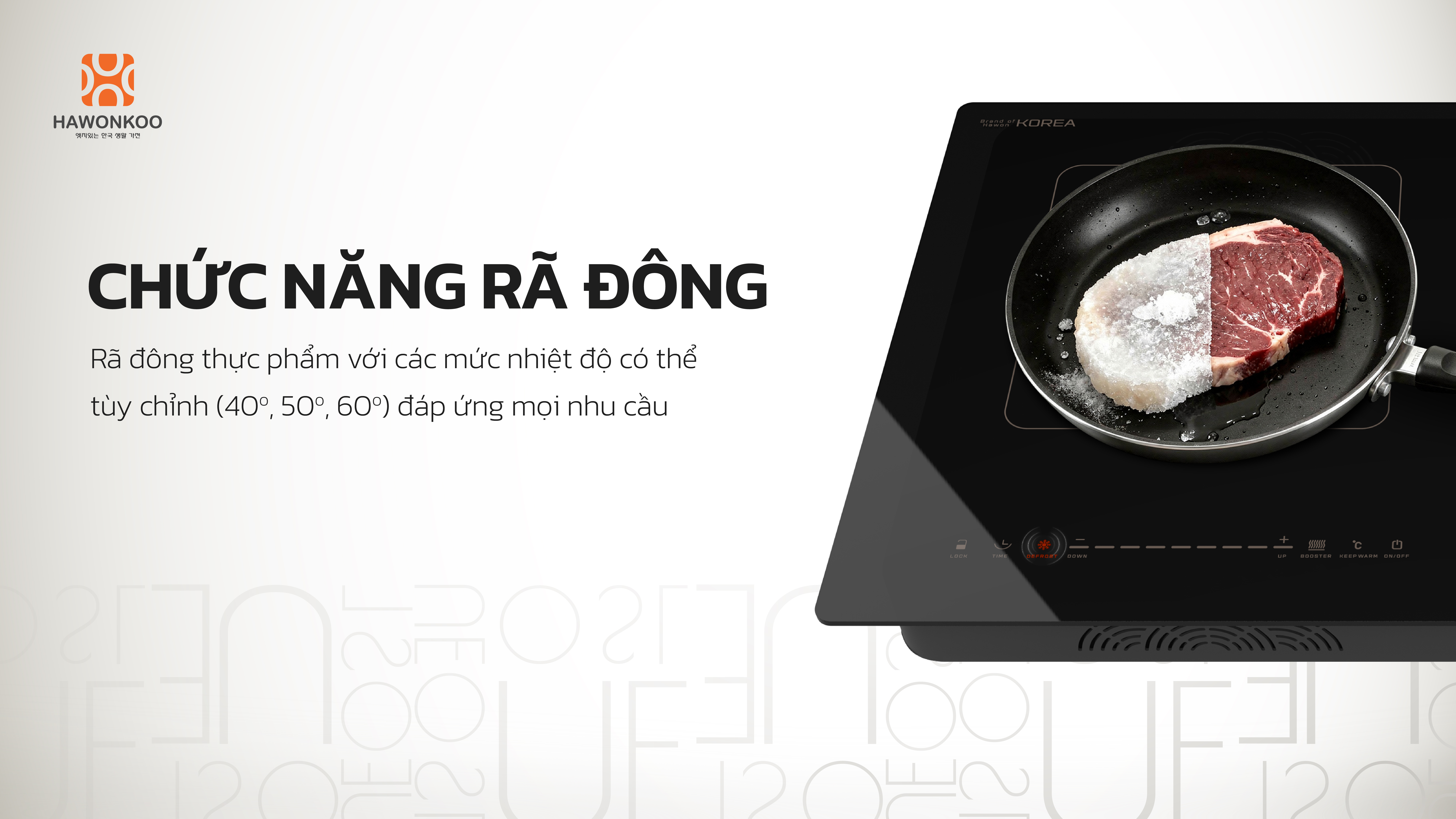 Bếp từ đôi Hawonkoo CEH-250 Inverter được trang bị chức năng rã đông tiện lợi với 3 mức nhiệt độ 40 – 50 – 60°C, giúp thực phẩm được làm mềm từ từ, giữ nguyên độ tươi ngon và hạn chế mất chất dinh dưỡng.