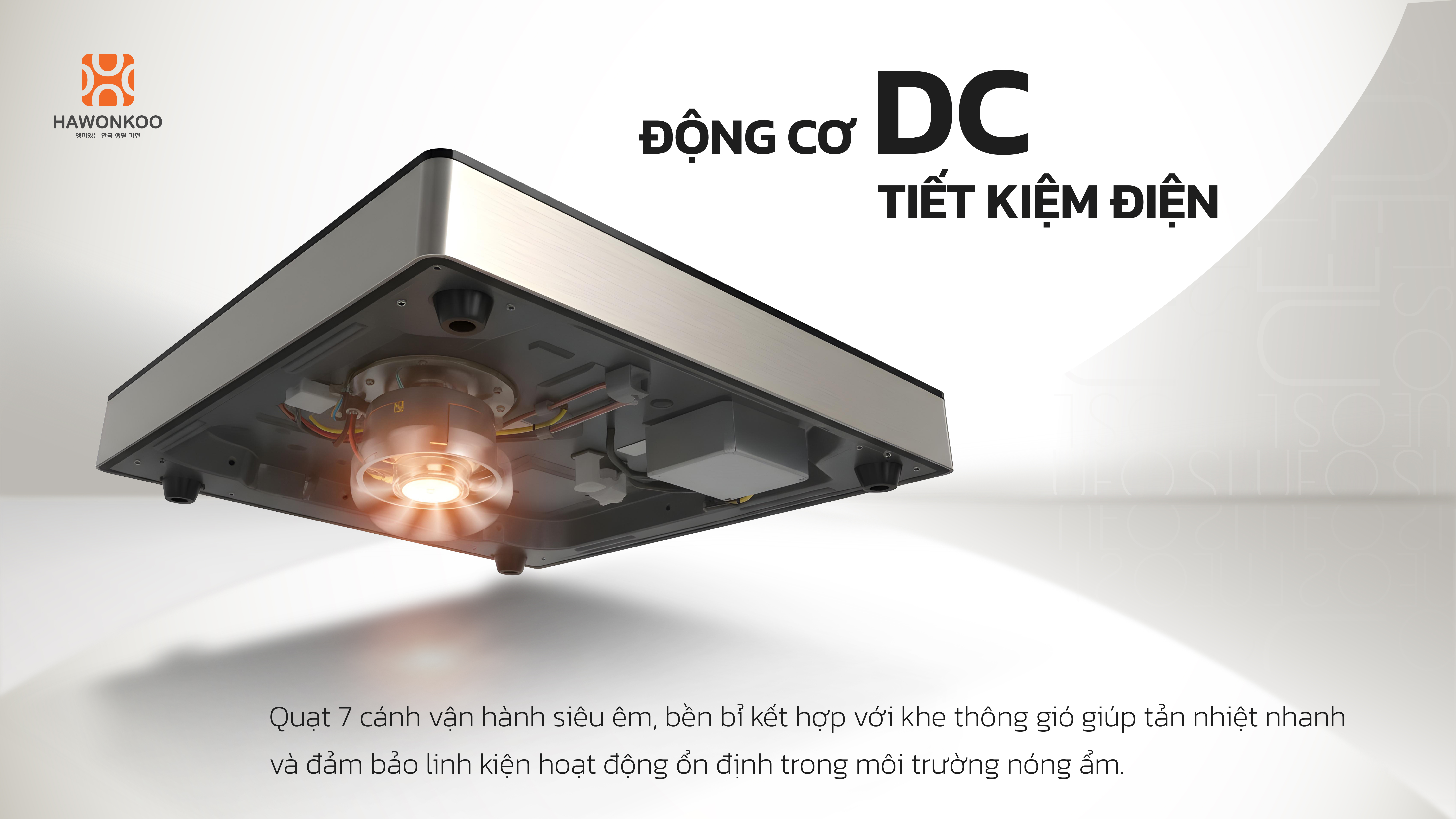Bếp đơn hồng ngoại Hawonkoo SEOUL-CEH-110 được trang bị quạt gió động cơ DC 7 cánh, cho khả năng vận hành siêu êm ái, tản nhiệt nhanh và ổn định. Động cơ DC tiết kiệm điện năng vượt trội, giúp bảo vệ linh kiện bên trong và kéo dài tuổi thọ bếp, đảm bảo bếp luôn hoạt động hiệu quả ngay cả trong môi trường nóng ẩm.