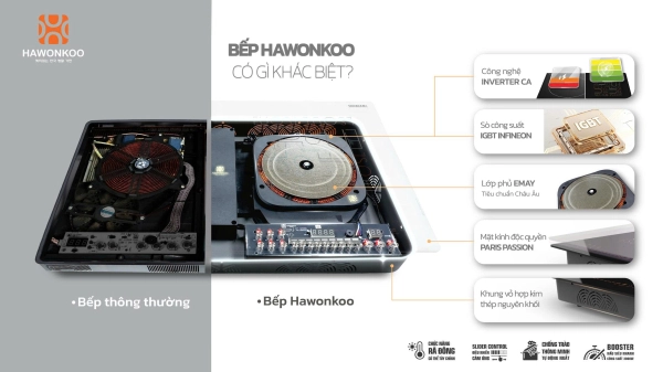 So sánh bếp từ Hawonkoo và bếp thông thường. Khám phá hệ thống an toàn IGBT Đức, công nghệ Inverter CA tiết kiệm điện và chính sách bảo hành 36 tháng vượt trội của Hawonkoo.
