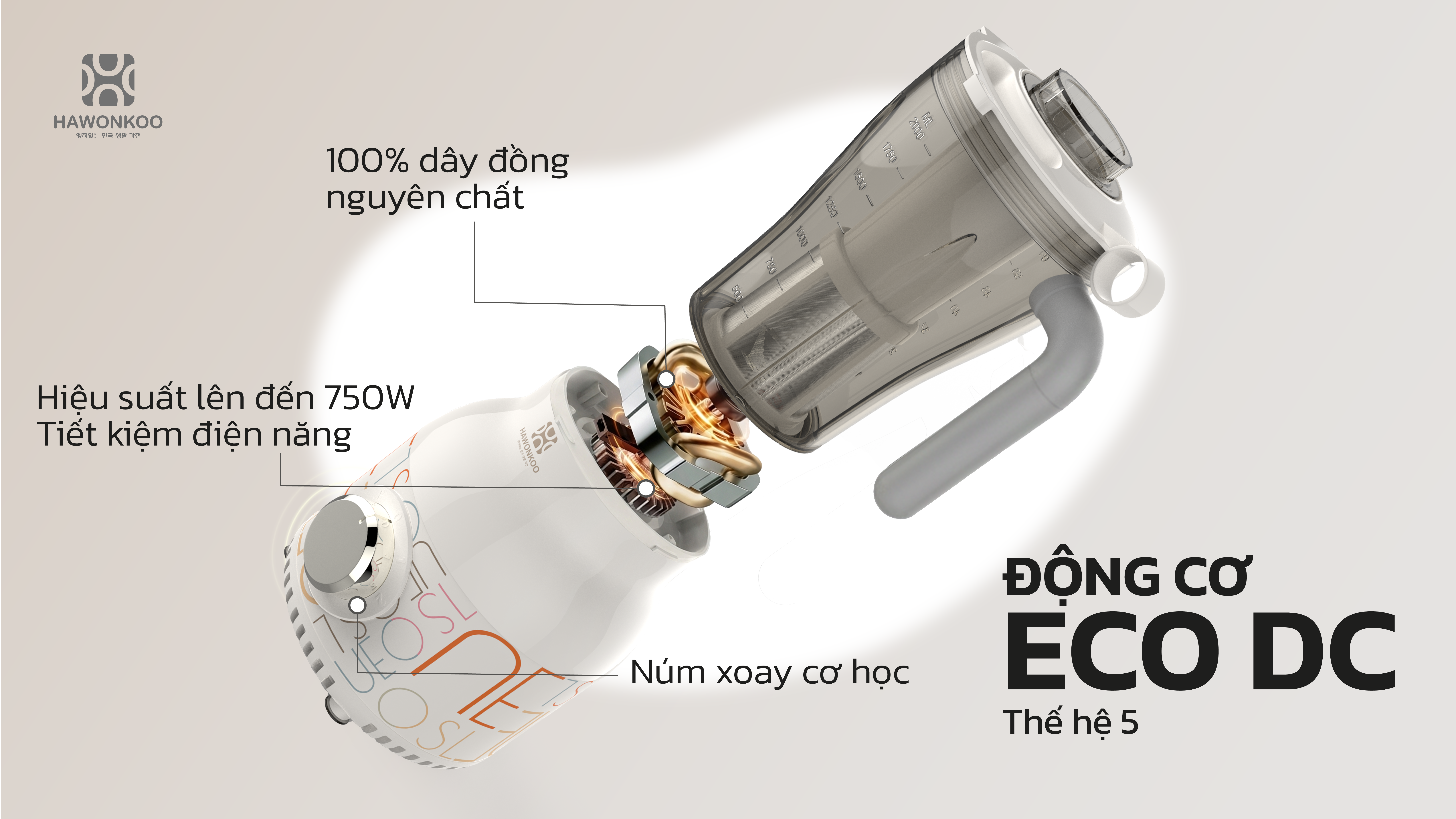 Trang bị động cơ ECO DC thế hệ thứ 5 với 100% dây đồng nguyên chất, máy vận hành khỏe, hiệu suất thực tế có thể đạt lên đến 750W nhưng vẫn tối ưu điện năng tiêu thụ. Động cơ hoạt động êm ái, ít rung, giảm ồn, dễ dàng xay nhuyễn cả những nguyên liệu cứng hoặc nhiều xơ. Kết hợp 2 tốc độ xay và 1 chế độ nhồi, đáp ứng linh hoạt mọi nhu cầu chế biến. Tính năng tự động ngắt khi quá nhiệt hoặc quá tải giúp bảo vệ động cơ, nâng cao độ bền và đảm bảo an toàn tối đa trong quá trình sử dụng.