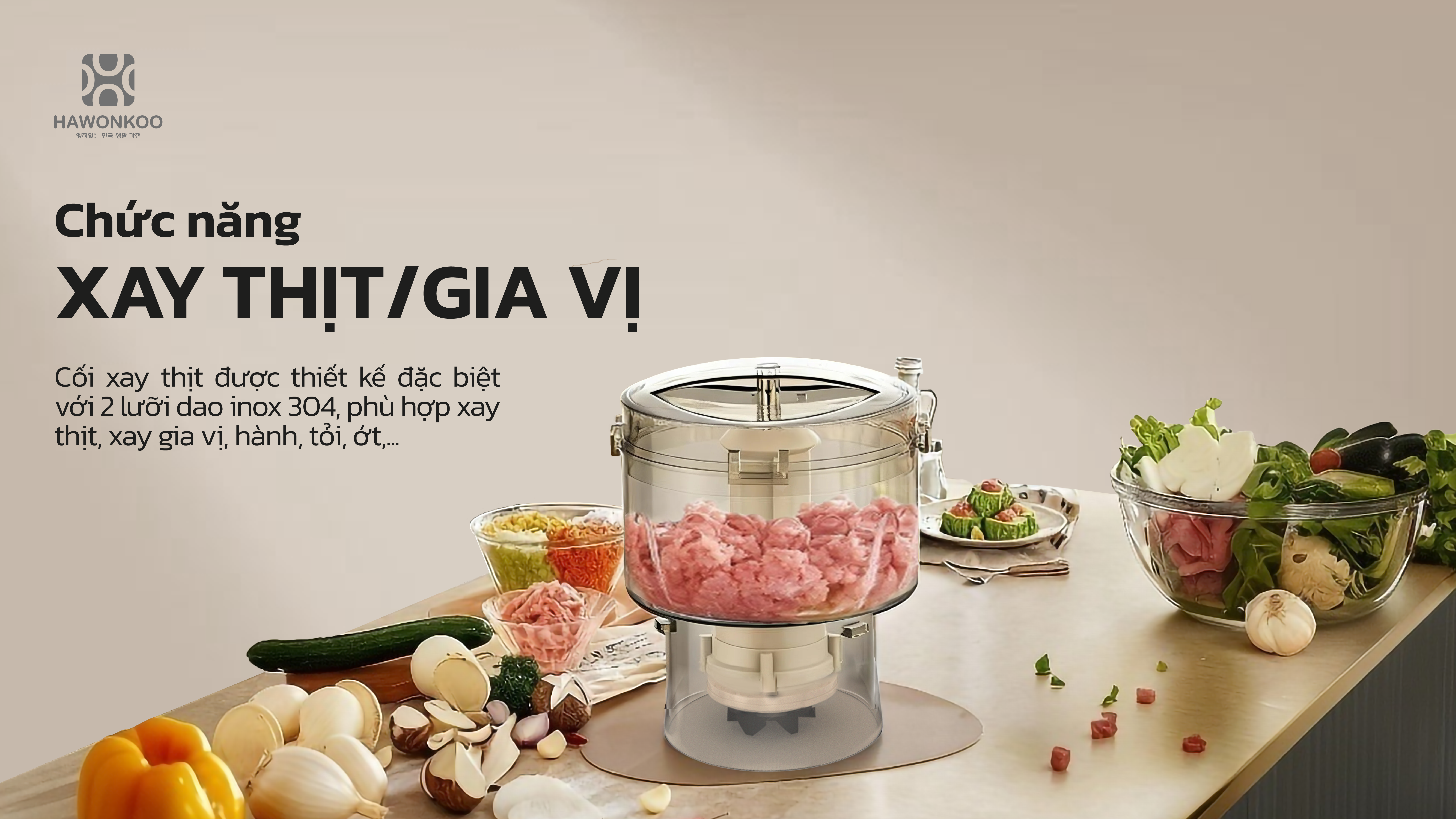 | CHỨC NĂNG XAY THỊT/GIA VỊ | Cối xay thịt được thiết kế đặc biệt với 2 lưỡi dao inox 304, phù hợp Xay thịt, xay gia vị, hành tỏi ớt… |