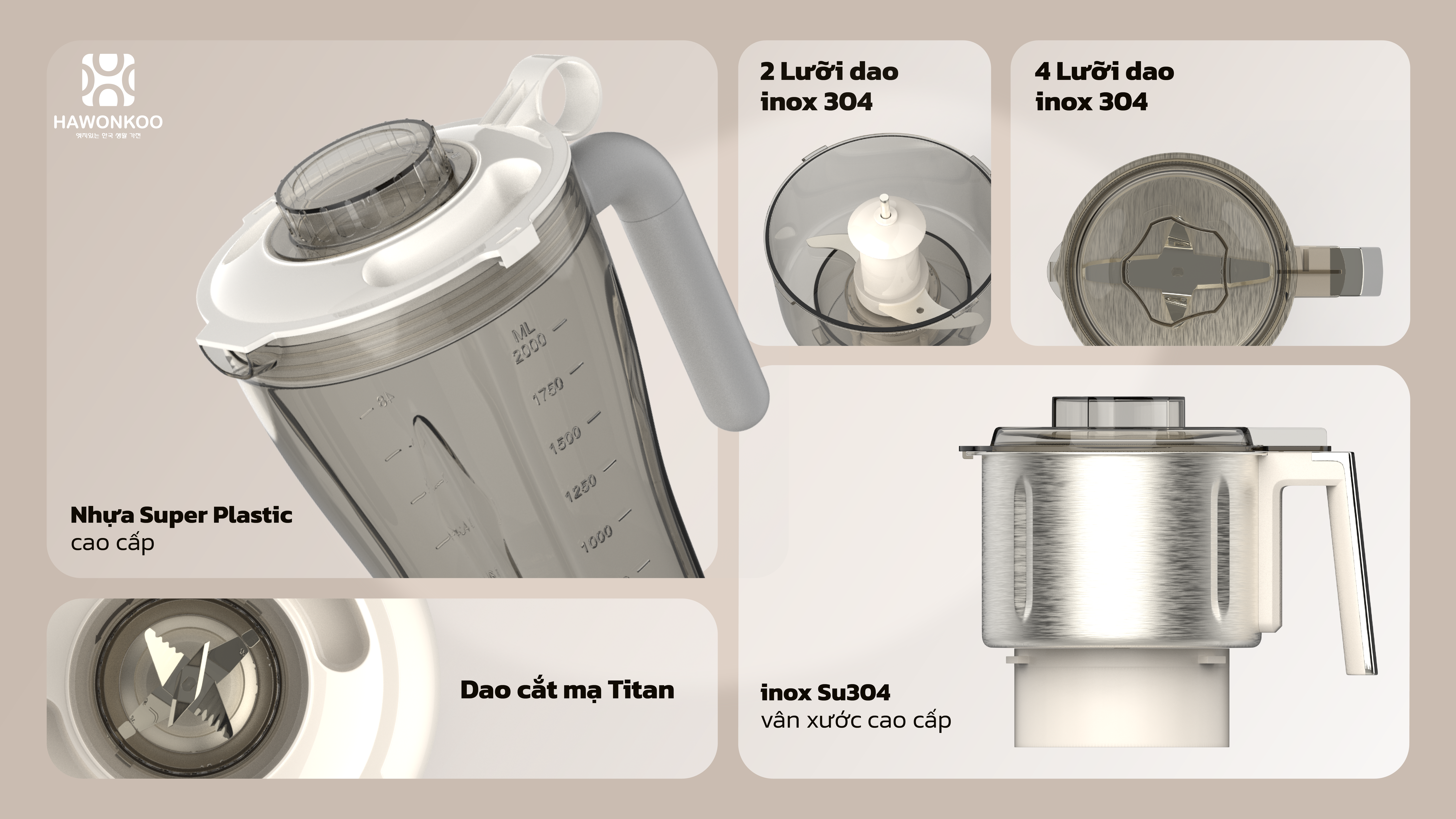 | CHỨC NĂNG XAY SINH TỐ | Lưỡi dao sinh tố được thiết kế đặc biệt với 6 lưỡi dao sắc bén, xếp 3 tầng so le nhau, có thiết kế răng cưa giúp dao khỏe, sắc bén, sử dụng chất liệu inox 304 được mạ Titan, không gỉ, tăng độ cứng lên đến 30% |